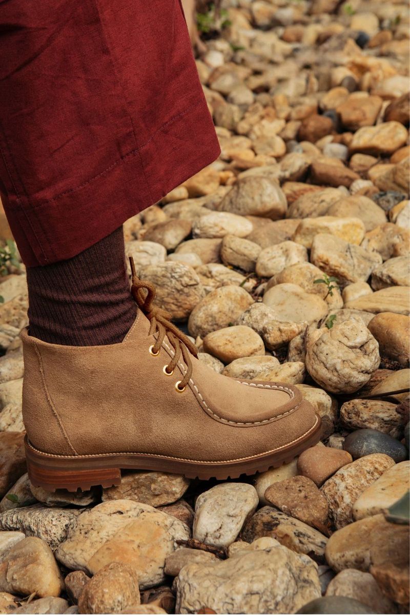 Com costuras manuais que valorizam o feito à mão, cabedal em camurção e cadarço de algodão, trazendo textura e autenticidade.