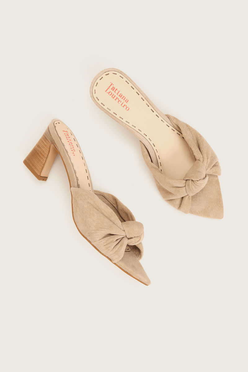 A Sandália Mule Bico Folha une bossa e sofisticação em cada detalhe. Confeccionada em couro camurça. O cabedal recebe um nó trabalhado manualmente, reforçando o cuidado artesanal e o charme único da peça.