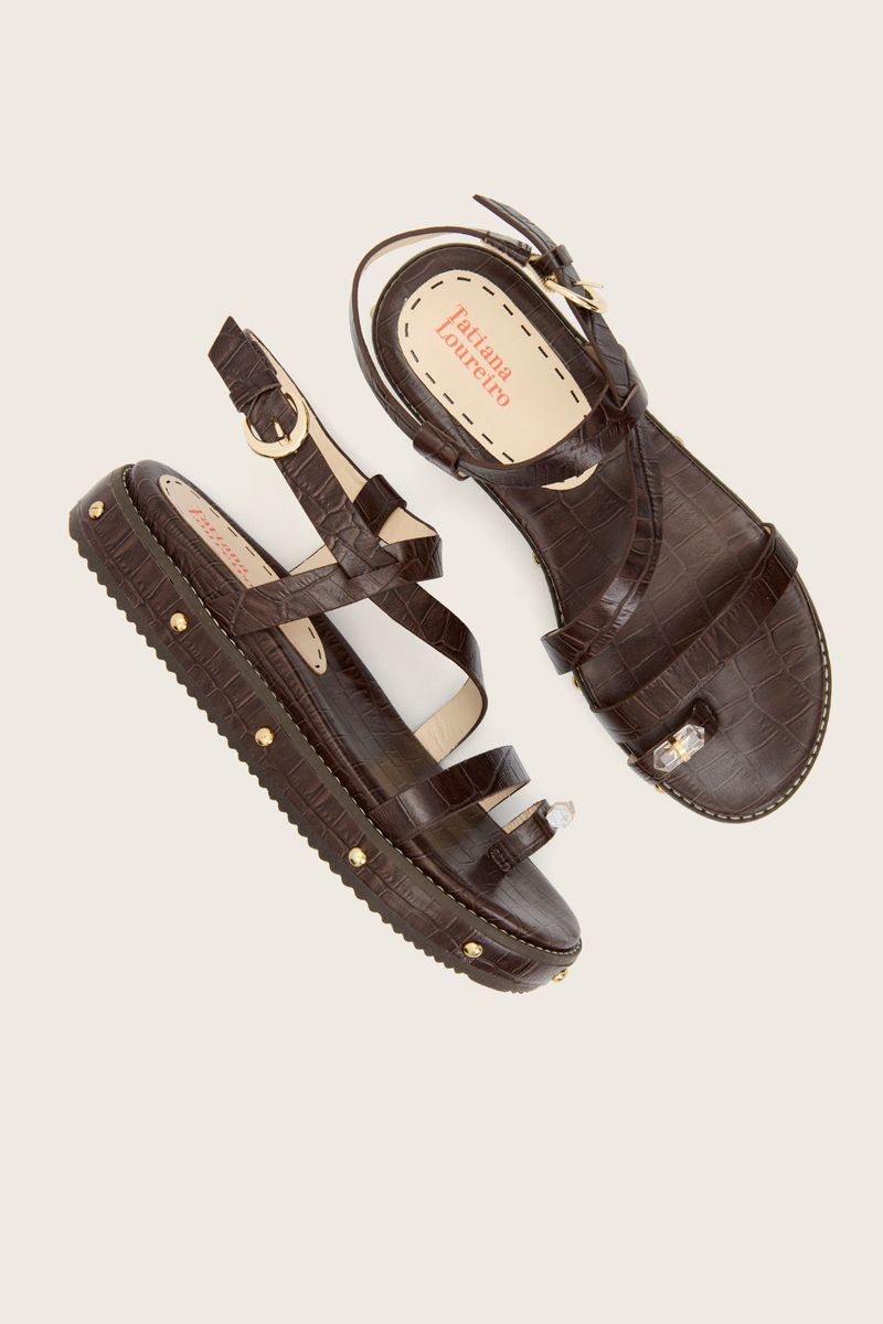 A palmilha com espuma oferece conforto a cada passo, enquanto a cepa de borracha forrada em couro exibe vira e aplicação manual de tachas metálicas, reforçando o cuidado nos acabamentos.