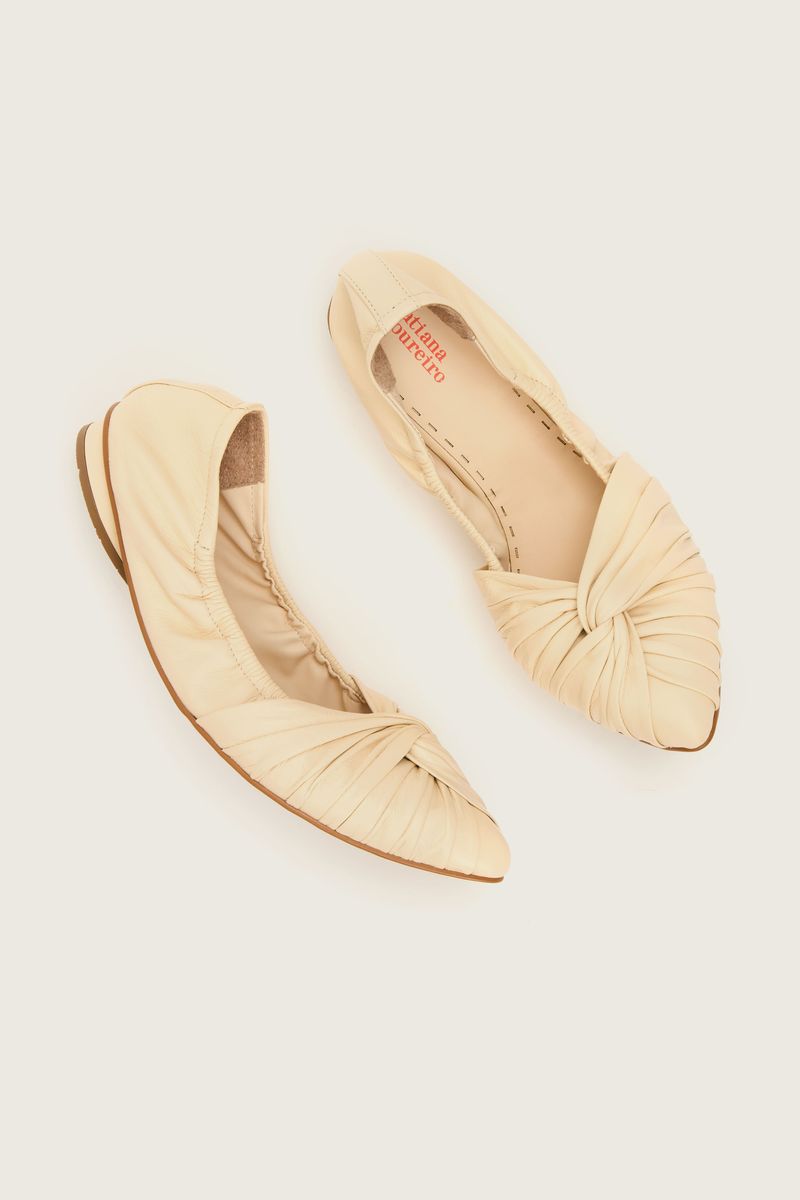 A Sapatilha Nó Mestiço é o modelo mais icônico da Tatiana Loureiro, plissada à mão em couro mestiço vestuário, um material nobre, leve, resistente e com toque macio, que envolve os pés como uma luva.