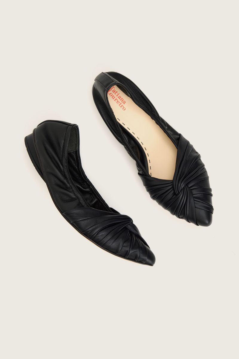 A Sapatilha Nó Mestiço é o modelo mais icônico da Tatiana Loureiro, plissada à mão em couro mestiço vestuário, um material nobre, leve, resistente e com toque macio, que envolve os pés como uma luva.