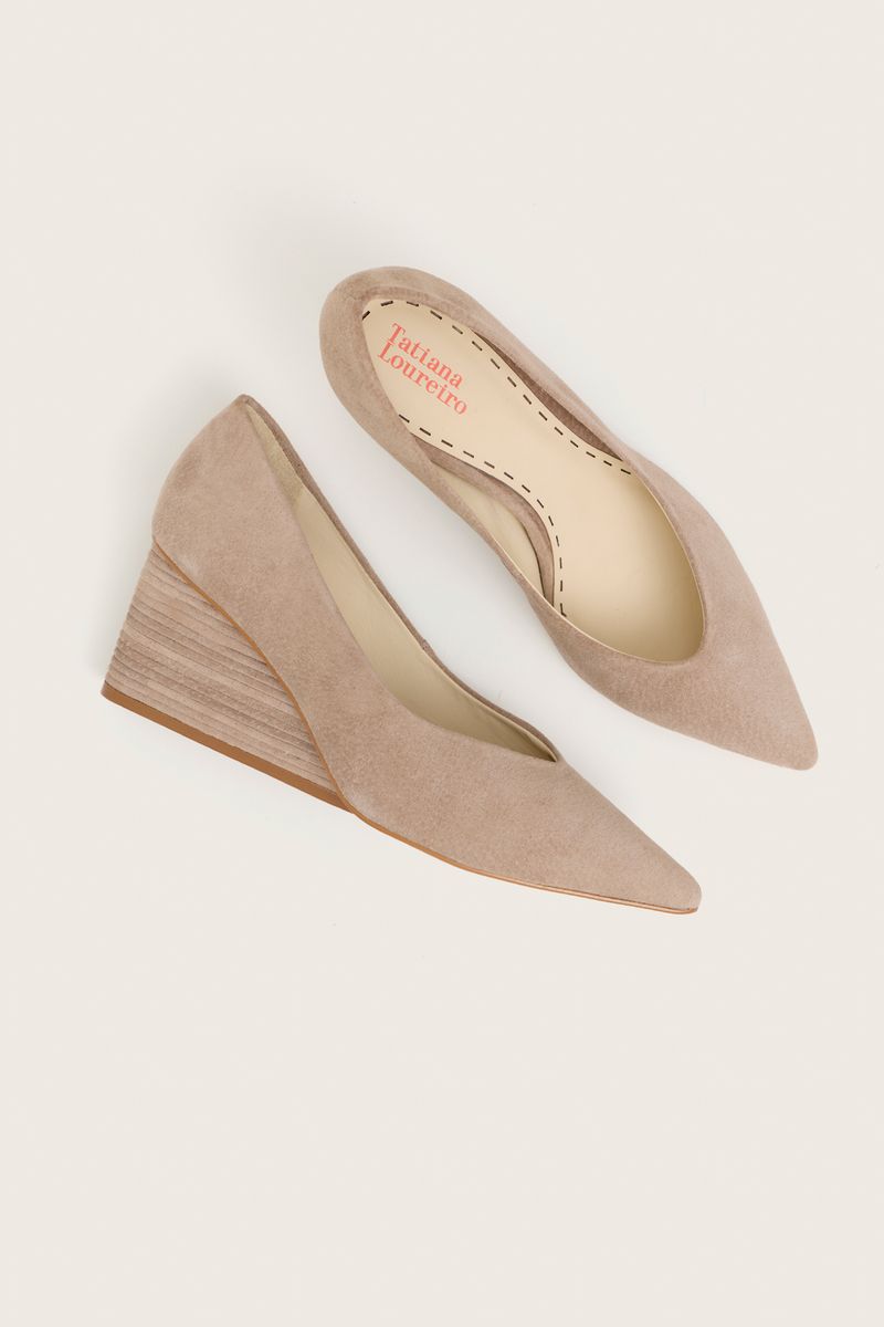 O Scarpin Anabela em camurça é a definição da tendência Modern Office: uma peça que resgata a silhueta tradicional do scarpin e a eleva com um toque fashionista e arquitetônico.