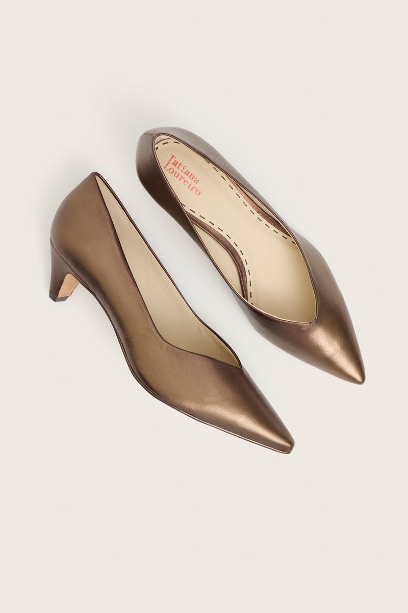 Confeccionado em couro liso, o modelo possui salto forrado e forro em couro, garantindo acabamento refinado e conforto. Nesta versão, o design equilibra estilo e bem-estar: o decote valoriza a silhueta, enquanto o salto kitten oferece elegância com conforto para o uso diário.